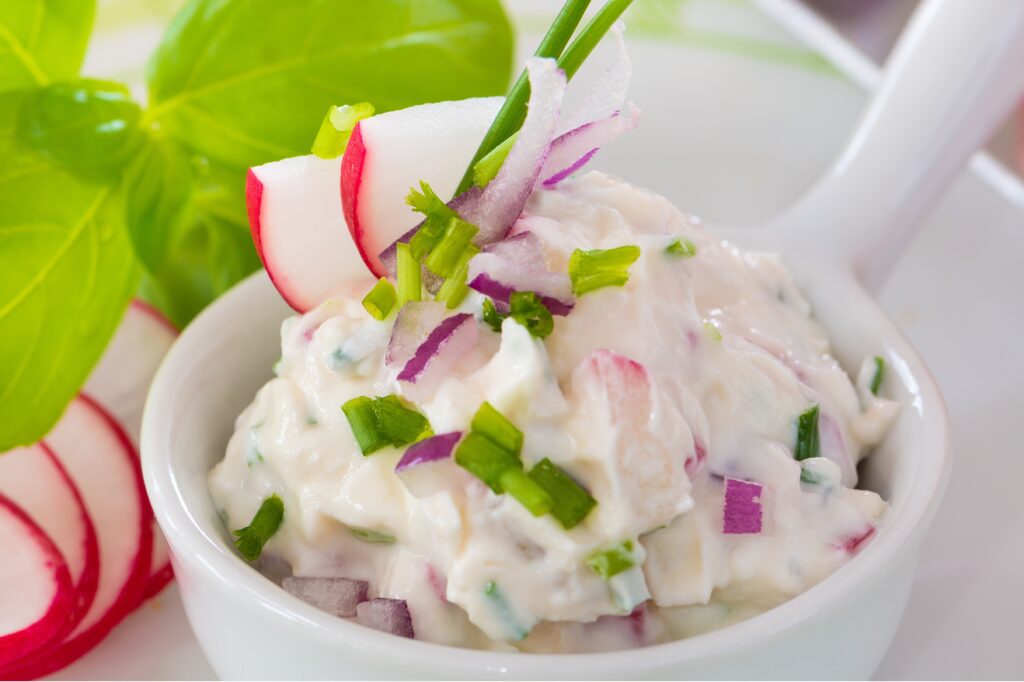 Es können auch Frühlingskräuter wie frischer Bärlauch oder Kerbel statt der Radieschen verwendet werden.
